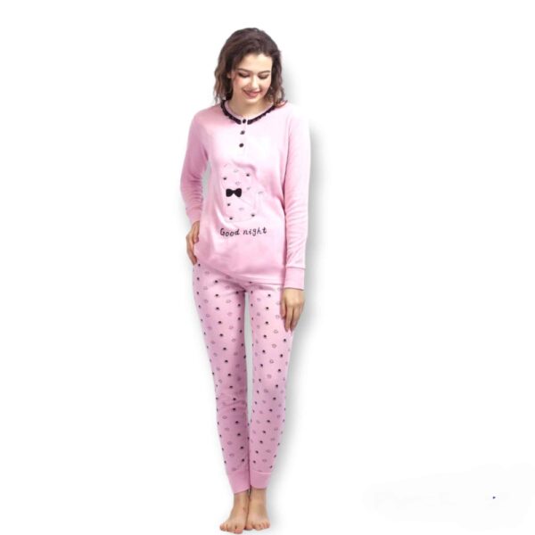 Πιτζάμα Γυναικεία Βαμβακερή με σχέδιο γάτα στην μπλούζα και σχέδιο στο παντελόνι . Διαθέτει επένδυση φανέλα εσωτερικά που προσφέρει ζεστασιά .